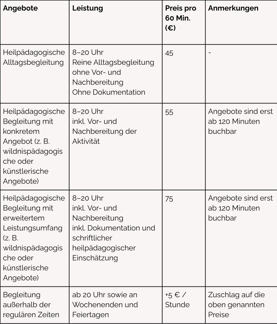 Je nach Angebot können zusätzliche Kosten entstehen, etwa für Verpflegung, Material oder Eintrittsgelder sowie bei größeren Entfernungen auch Fahrtkosten. Selbstverständlich werden diese im Vorfeld transparent mit Ihnen abgestimmt.